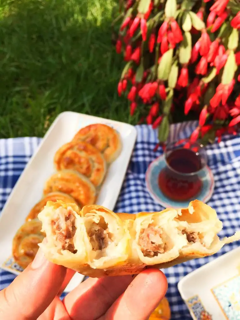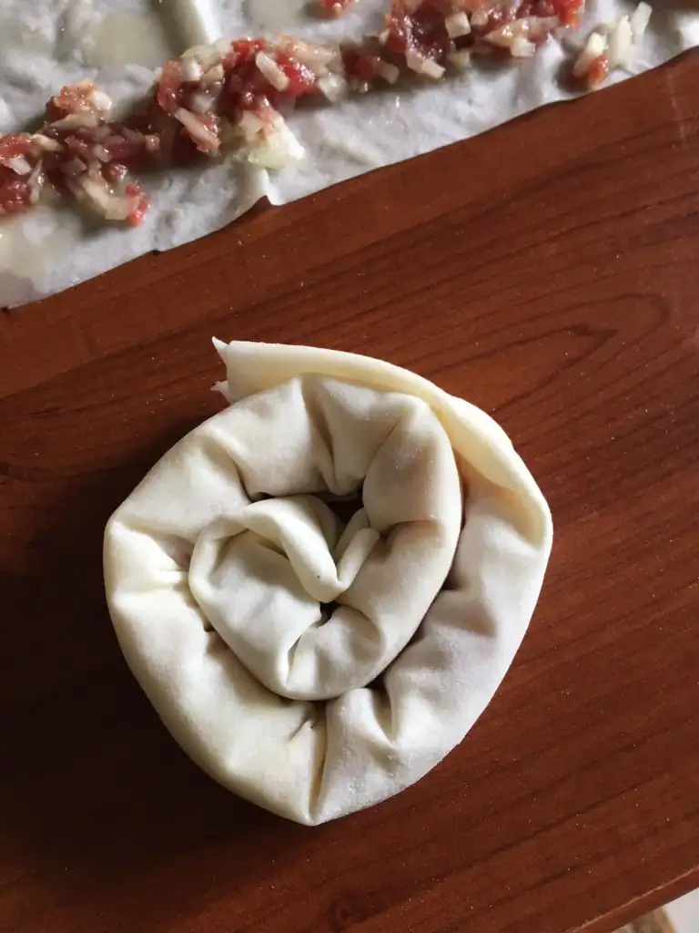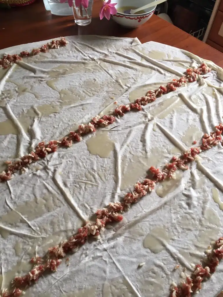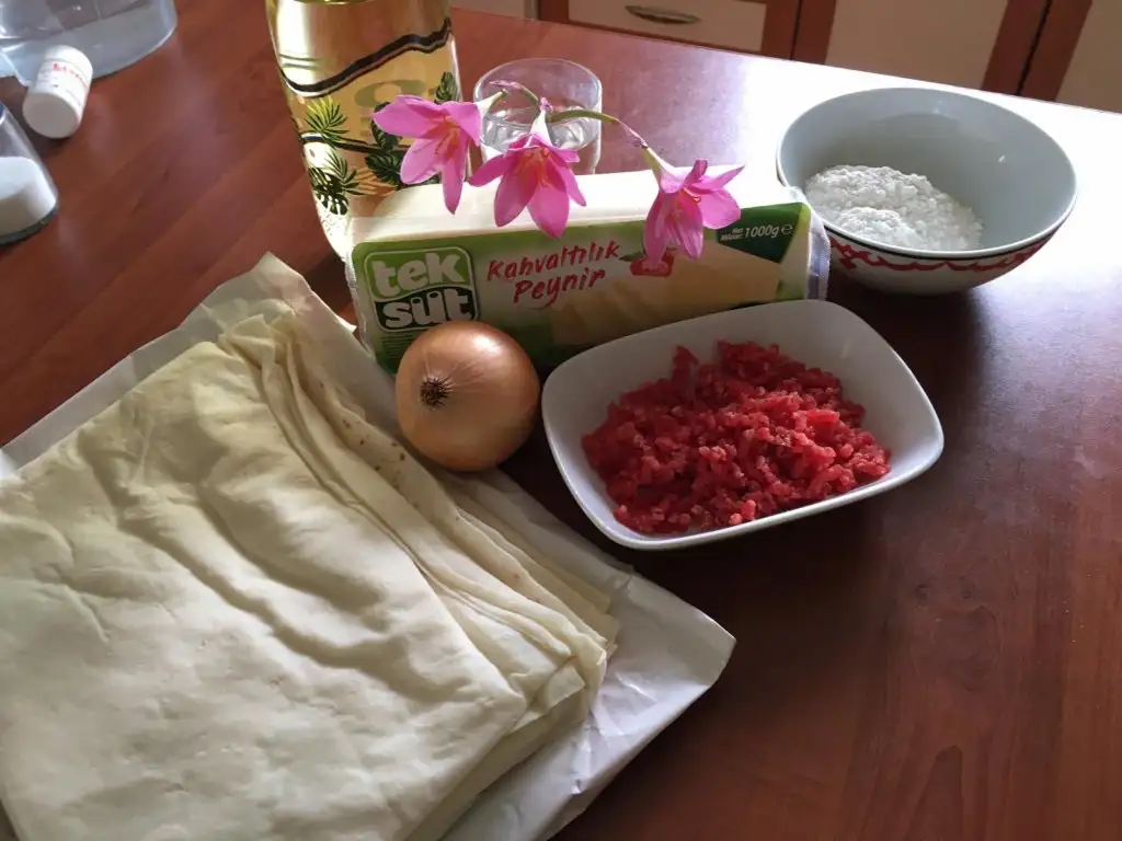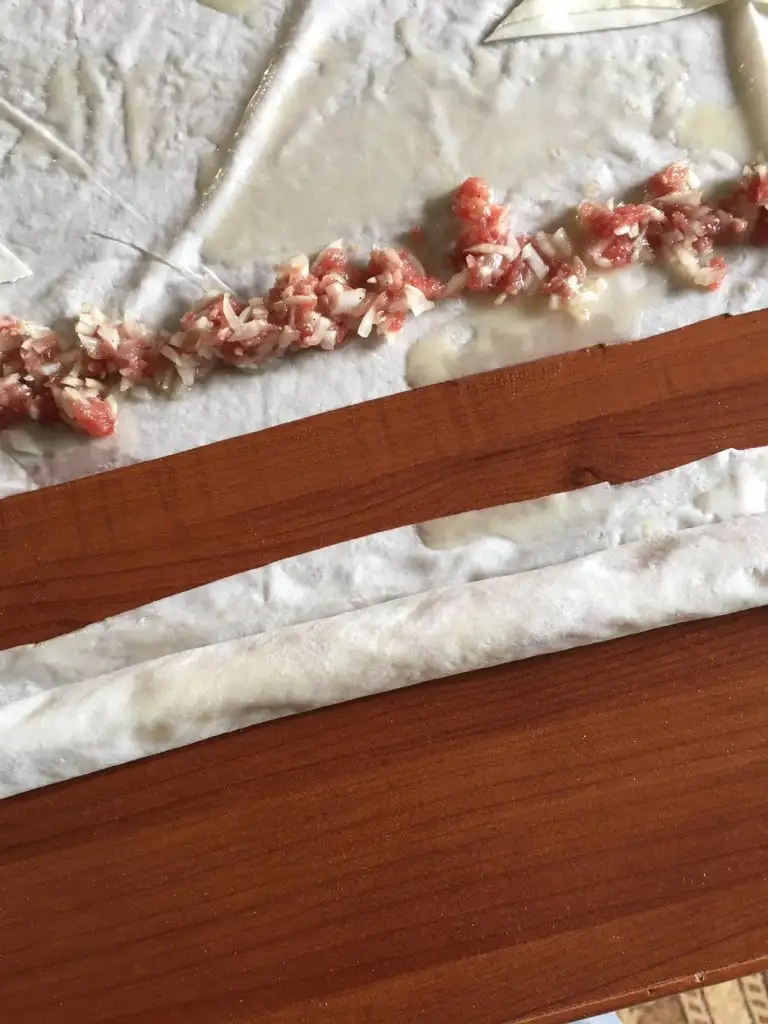 Kıyma harcımızı şerit halinde yufkamıza serip, ince rulolar yapıyoruz. Ardından kendi etrafında dolayıp, Gül böreğimizi yapıyoruz.
