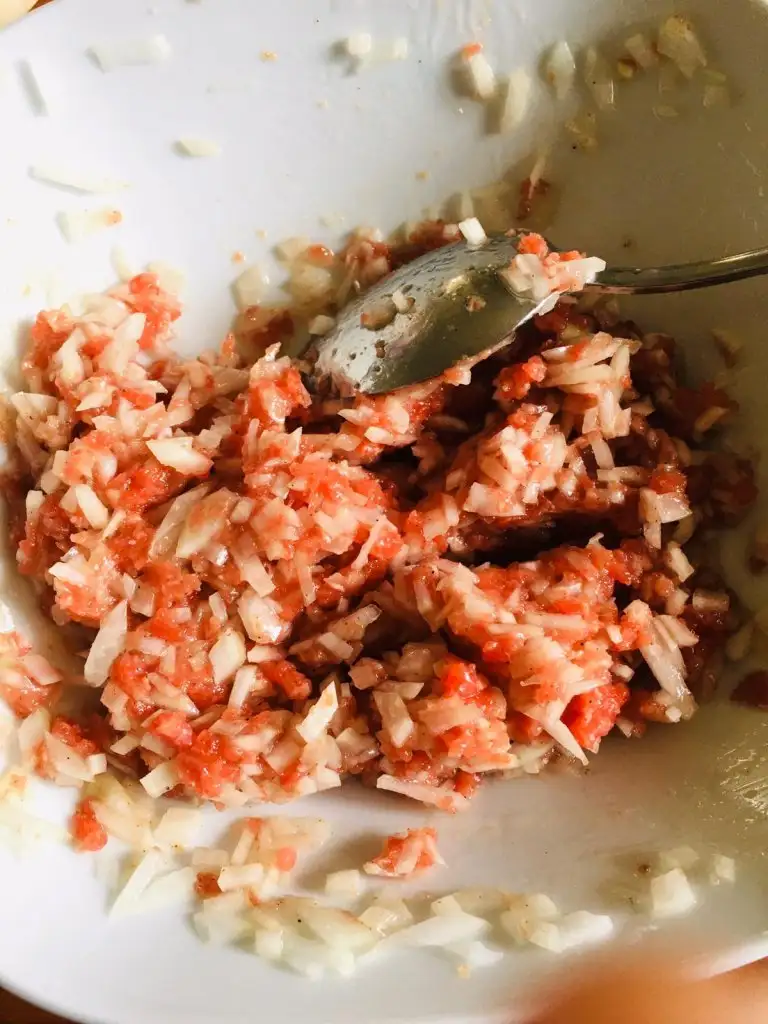 Kıyma, doğranmış soğan, tuz, karabiber ve azıcık yağ ile iç harcımızı hazırlıyoruz.