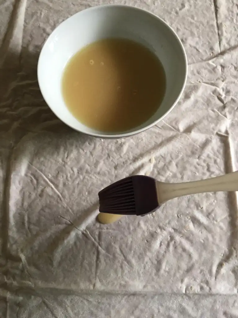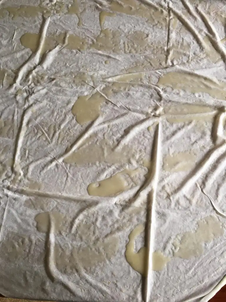 1 yufkamızı yayıp, unlu yağ sosumuzdan fırça yardımı ile yufkamıza sürüyoruz.