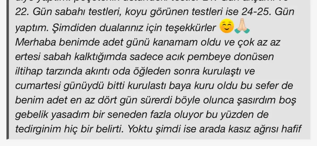 Merhaba benimde adet günü kanamam oldu ve çok az az ertesi sabah kalktığımda sadece acık pembeye donüsen iltihap tarzında akıntı oda öğleden sonra kurulaştı ve cumartesi günüydü bitti kurulastı baya kuru oldu bu sefer de benim adet en az dört gün sürerdi böyle olunca şasırdım boş gebelik yasadım bir seneden fazla oluyor bu yüzden de tedirginim hiç bir belirti. Yoktu şimdi ise arada kasız ağrısı hafif
