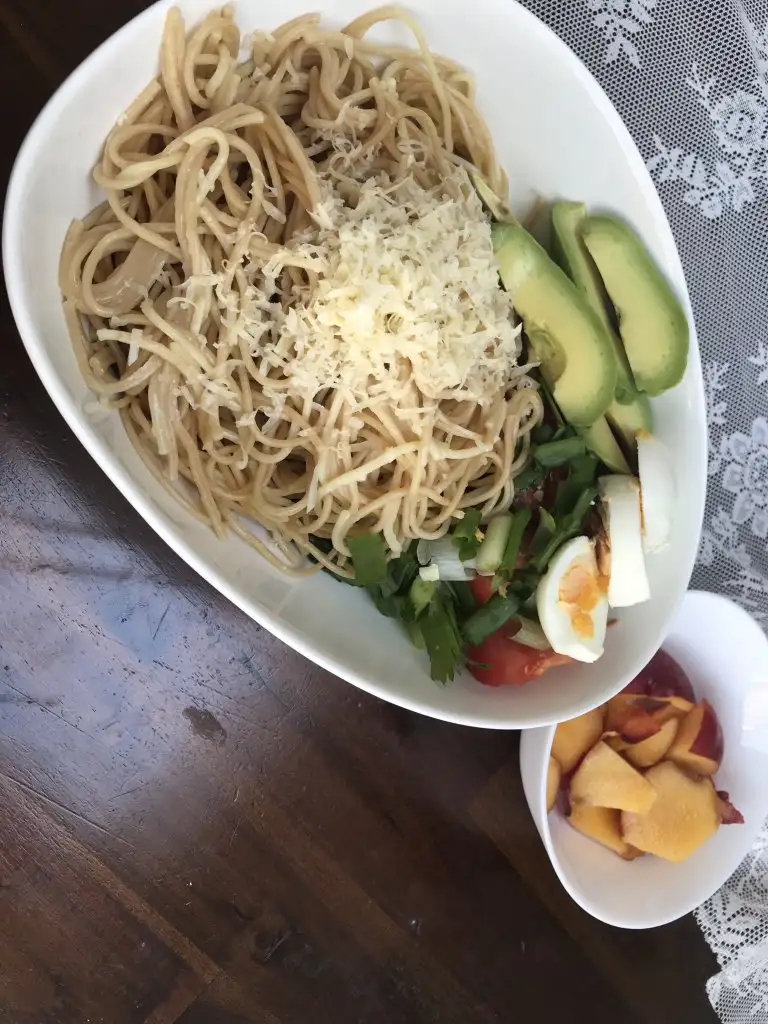 Makarna yarim avocado domates salatalik yesil sogan ve 1 yumurta var bu tabakta.. uzerinede kasar rendeledim..sonrada dayanamadim ayni saat icinde tabii kek yedim ve cocuklara yaptigim yarim milfoyden borek..haydi gazamiz mubarek ola