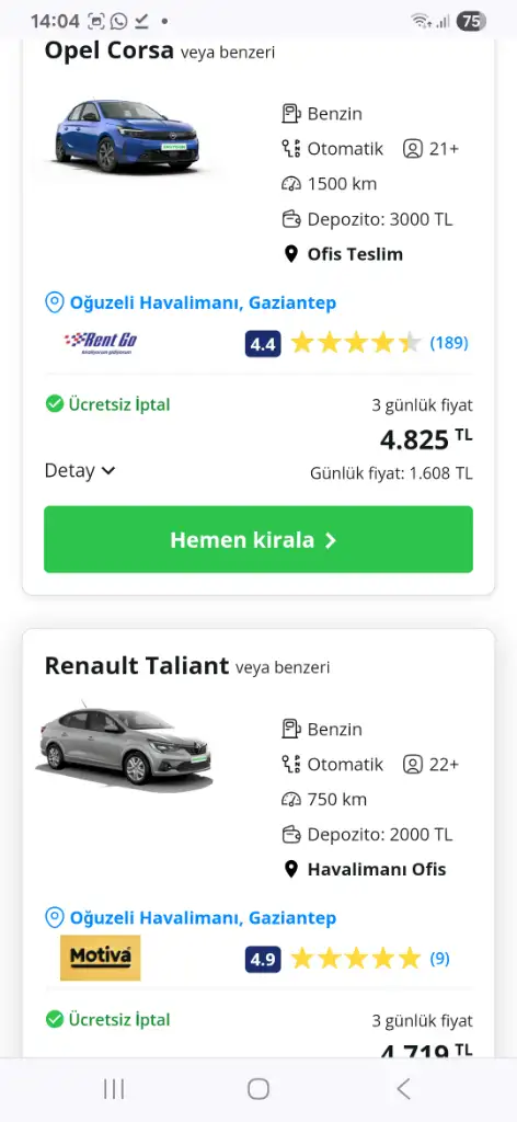 arac kiralama fiyatlarina baktim sizin icin antepten alip antepe bırakacaksiniz, 3 gece 4 gun diye hesapladim gaziantep havalimanindan alip ayni havalimanina biraksaniz ilk girdigim sitede