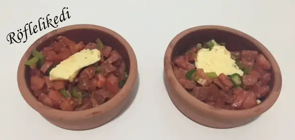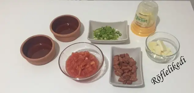 Sonra güveç kaselerine hepsini alıp karıştırıp üzerine de bir parça tereyağ ekleyip, sucuklar yumuşayana kadar fırında pişiriyoruz.