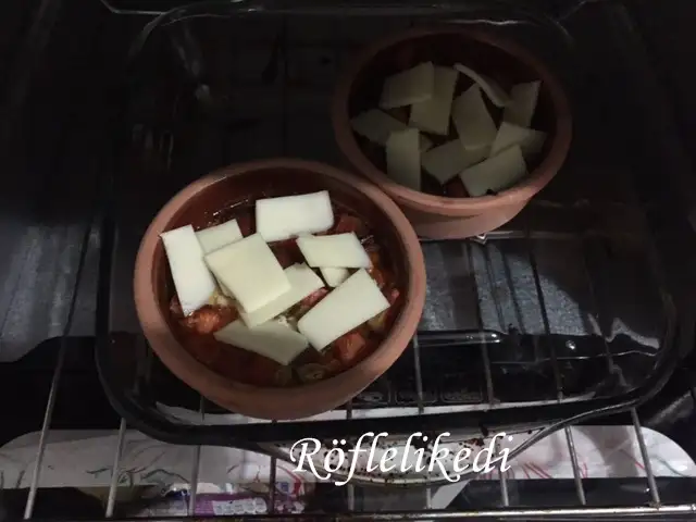 Ardından güveç kaselerinin üzerine kaşar peynirini koyup peynir eriyip kızarana kadar pişiriyoruz. Sıcak Servis yapıyoruz...