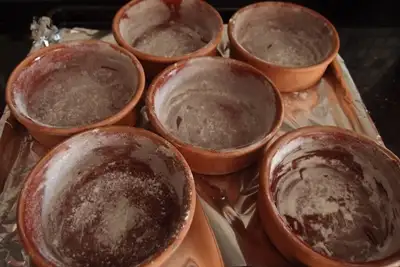 Güveçleri yağladıktan sonra üstüne 1 yemek kaşığı buğday unu serpiyoruz aynı unu diğer güveçleri unlamak için kullanıyoruz