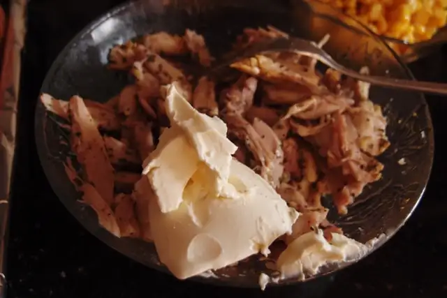 haşlanmış olan tavukları tiftiyorum ve 2 kaşık labne peyniri ile tuz ve baharatı ekliyorum