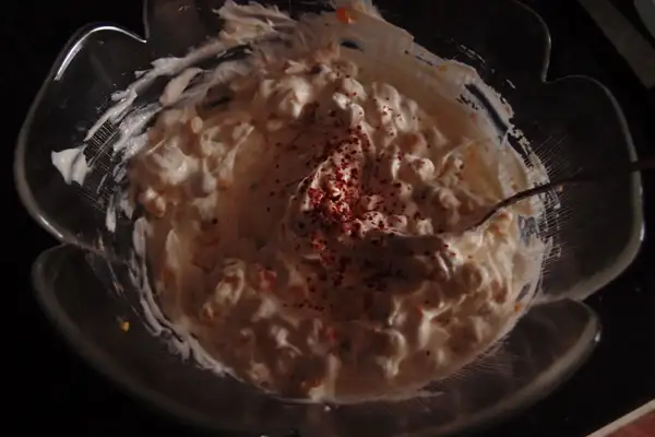 Mezeyi hazırlamak için süzme yoğurdun içine bir miktar sebzeli garnitür, haşlanmış mısır ve baharat ekleyip karıştırıyorum