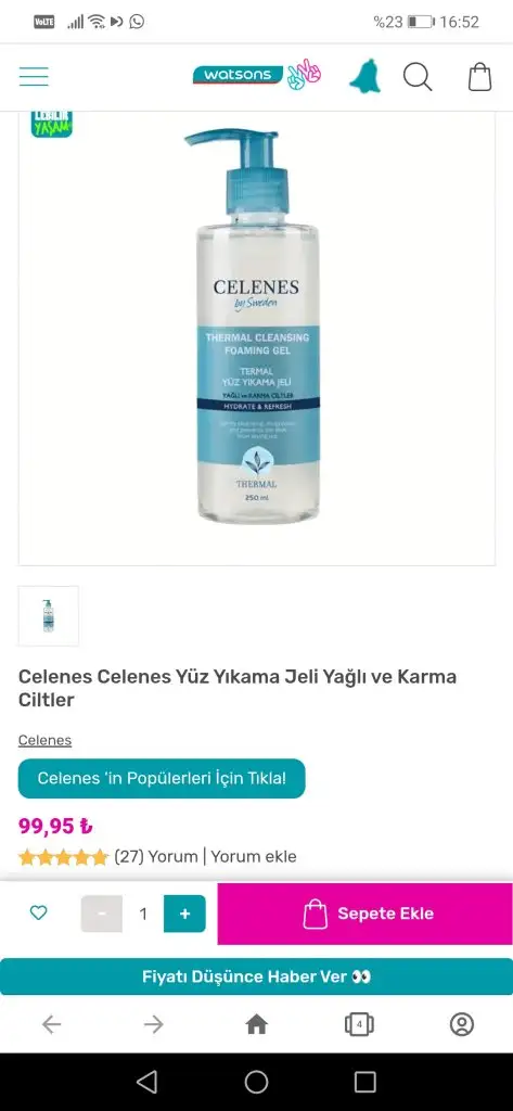 Ayy bu iyi oldu teşekkürler. fiyatlar çok yüksek cidden gidip bakayım karşılaştırayım en iyisi diğer türlü maaşallahh yaniÇelenesler nette pahalıymış ben neredeyse yarı fiyatıma aldım gratisten watsonstan. Oralara bakın
