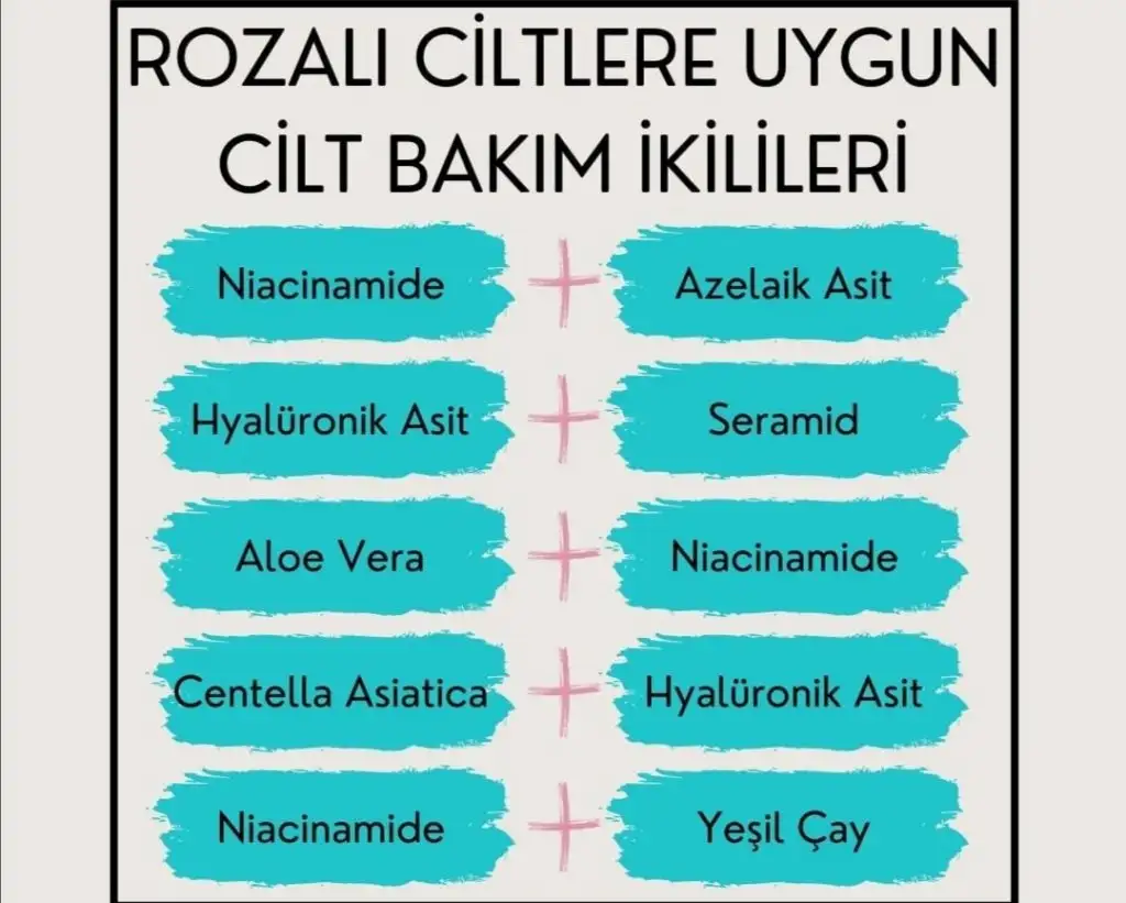 Roza cilt sorunu icin "Licorice root extract" öneriliyor, ben amazondan siparis vermistim, güney koreden geliyor, youtube'da dr dray adli dermatolog önerdigi icin almistim. adi: It'S SKIN Power 10 Formula LI Effector. Bu ürün olmasa da ayni icerigin oldugu baska bir ürün de ayni isi görür. Bu arada ürün resimlerinizi gördüm. Sanki cok fazla ürün kullaniyorsunuz gibi geldi bana. Ben olsam etkili asitlerden bir süre uzak dururdum (azeleik asiti kastetmiyorum, o roza sorunu icinmis), sakinlestirici, yatistirici ürünlere, kremlere agirlik verirdim.