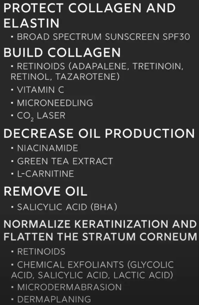 5. Gözenek görünümünü azaltmak icin: retinoid, kimyasal peeling (glikolik asit, salisilik asit, laktik asit), microdermabrasion, dermaplaning.