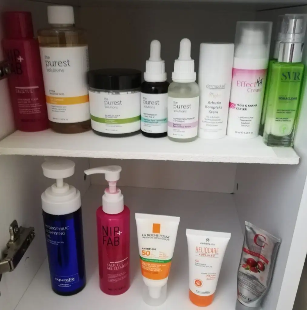 daha önce dolabımın resmini çekmiştim yine göndereyim kullandığım ürünler bunlar Eki Görüntüle 3143203 haftada bir Enzim peeling 2 haftada bir Salisilik Asit kullanırım ölü deriden kurtulmak için hepsi bu, yıkama jelimde iki ayrı çeşit çünkü regl dönemi ya da mevsim geçişi veya denediğim ürünlerden kaynaklı bir sivilcem çıkarsa etkili olsun diye nip fab salisilik asitli yıkama jelini kullanırım normal zamanda hatta büyük çoğunlukla gelenes termal yıkama jeli kullanırım