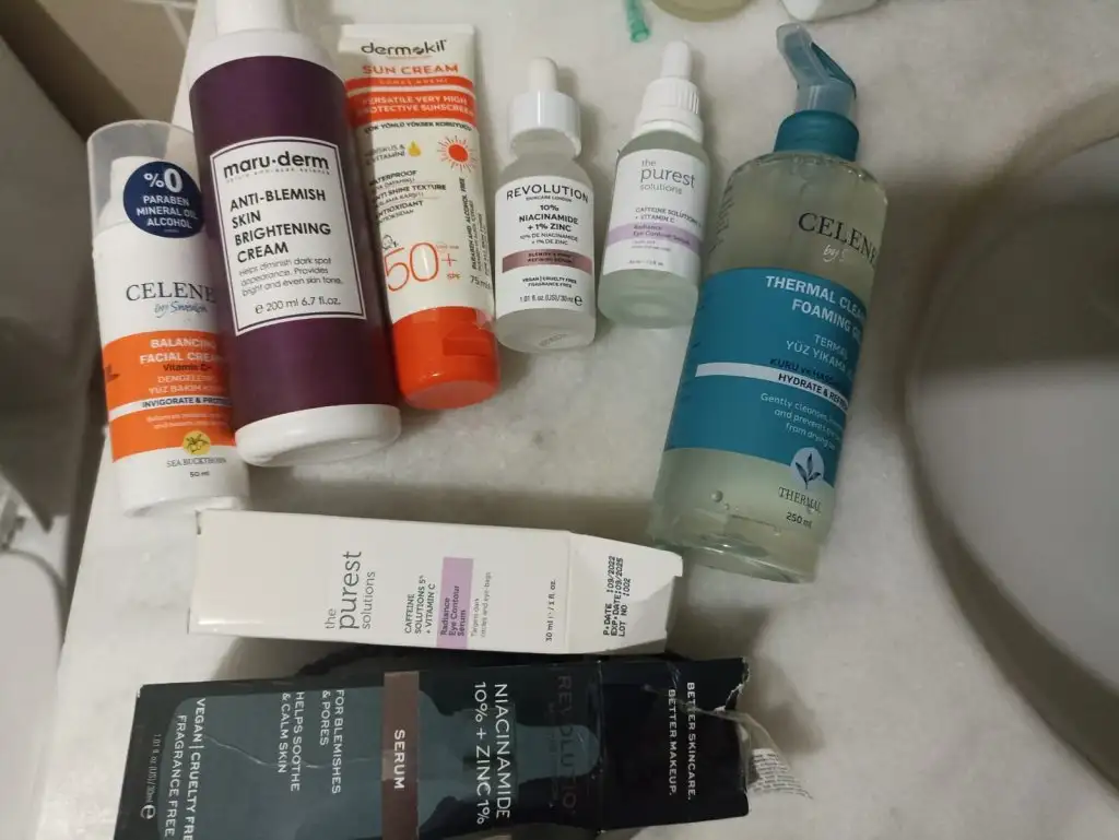 Ve nasıl bir rutin oluşturacağımı hale bililiyorum tek dikkat ettiğim nemlendirici ve güneş kremi. Çift aşamalı temizlik. Diğeri elime ne geçerse sürdüm. Yaklaşık yaz başından beri yapıyorum bi ara temizlemeden sürekli ürün kullanmıştım ama temmuzdan beri devam bi değişim yok