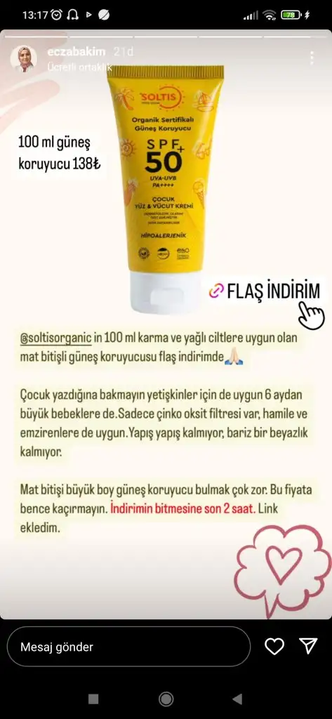 Soltia mineral filtreli güzel bir marka. İçerik puanı da güzel. Sebbo nun paylaştığı çocuklar için olanı yetişkinler içinde var. Yaz boyu 200-165 arasıydı şu an 141 lira alınabilir bir güneş kremi.soltis diye bir marka heççç duymadımmm sebbo.