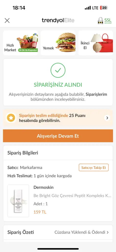 LYine dayanamadım, kolajenin yanına Dermonkin göz kremi ve Dermoskin 230 ml nemlendirici ekledim.ama iyi yaptım bence. Evde Eczane sitesinden ilk kez alışveriş yaptığım için 30 TL kupon kullandım.