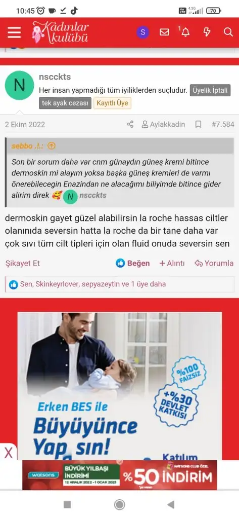 Nisa.bana böyle bir yorum yapmıştı la Roche in güneş kreminide bir bakayım senin dediğine de bakayım ona göre alayım bu akşam tşk cnnKova hatunu