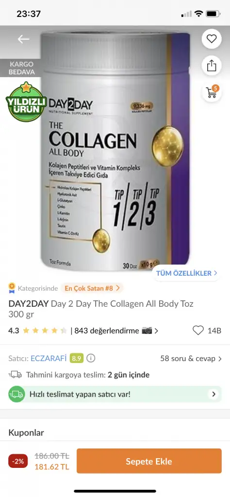 9336mg kolajen içeriyor her kaşığındalikit değil diğer day 2 day de toz.ama içindeki kolajen oranı çok daha fazla.