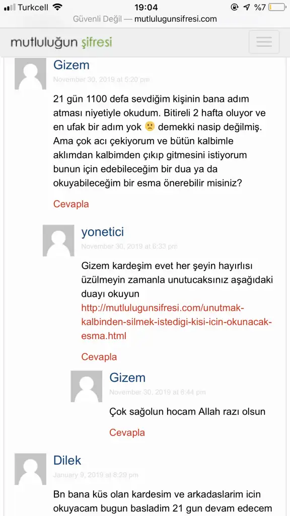 Kuzum senin neye üzüldüğünü biraz tahmin edebiliyorum ama sen duanda sevdiği kişi ile kalplerini tekrar birbirine isindir ama sevdiği kişi hakkında hayırlısı değilse unuttur yüreğine ferahlık ver diye dua ediyordun belki hakkında hayırlısı budur sen ben biz bilemeyiz duaya olan inancinida lütfen kaybetme su hayatta tek tutunagimiz dua ınan hepimiz zor şeyler yaşıyoruz burdaki herkes bir şeyle imtihan ediliyor Allah daha kotu imtihanlardan saklasin hicbir sey senin icin dunyanin sonu degil belki daha guzel seylerle karsilacaksin kim bilir duaya sımsıkı saril eğer istedigin bir şey olmazsa tevekkul edip hakkimda hayirlisi buymus de ve daha kötü şeylerle sinanan insanları düşün Allah hakkımızda her şeyin hayirlisini nasip etsin insaAllah AminBen bi sure katilamicam canim. Yoruldum bazi seylere inancimi kaybettim cok yoruldumkısa zamanda toparlanip inancla araniza katilirim insallah