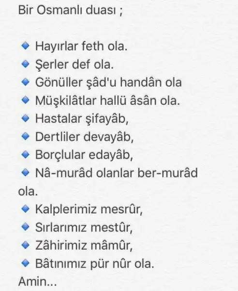 Bana , oğluma , eşime , anne - babama , kardeşlerime , burada bana dua edenlere ve tüm mü'minlere sağlık , sıhhat , afiyet , huzur , neş'e , bereket , bolluk , helal rızık nasip eyle .. Kötü insanlardan , kötü duygulardan ve kötü davranışlardan bizleri koru ..