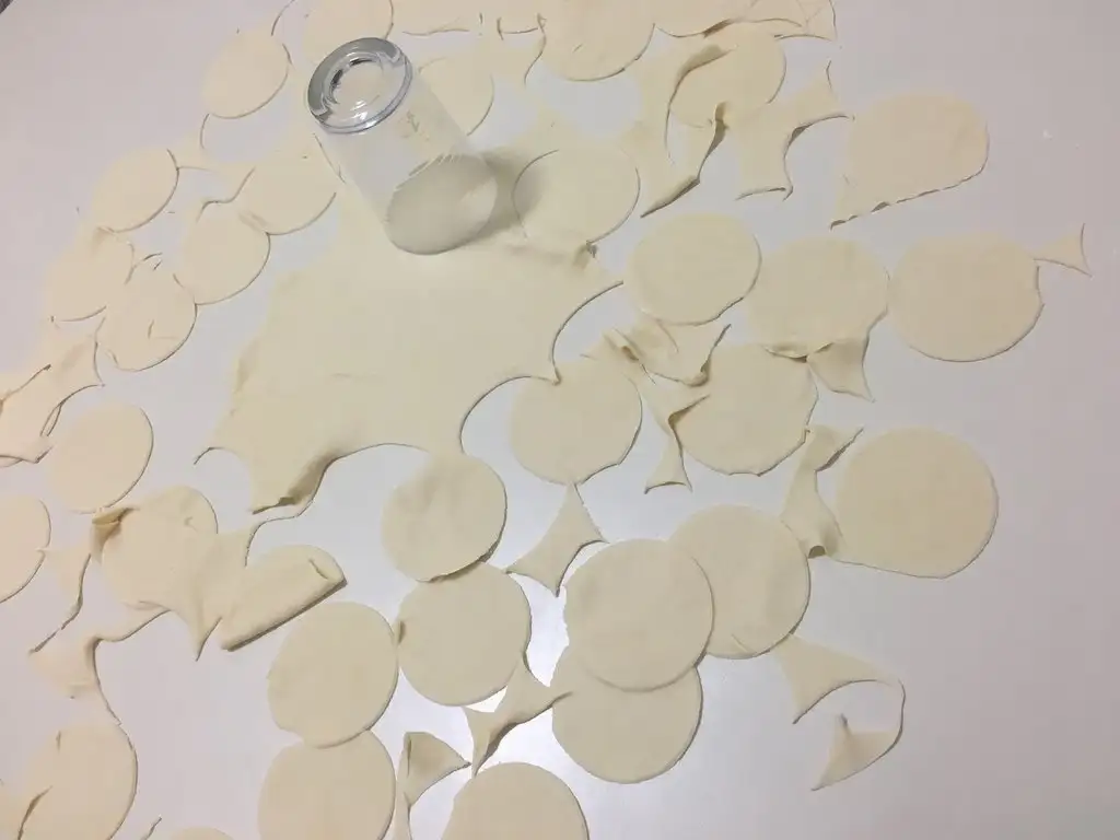 Çok ince olmayacak şekilde açılır ve su bardağı yardımıyla kesilir.