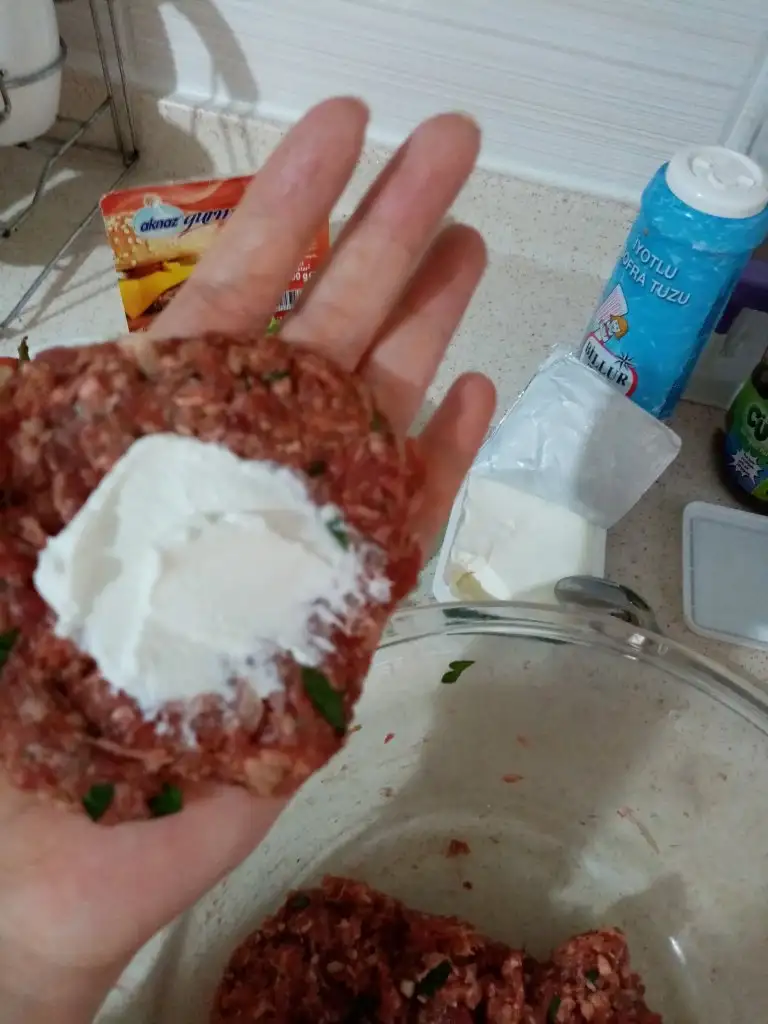 Kıyma ve bütün malzemeleri karıştırıyoruz büyük parçalar kopardığımız köftemizin içine bir tatlı kaşığı Labne koyuyoruz.
