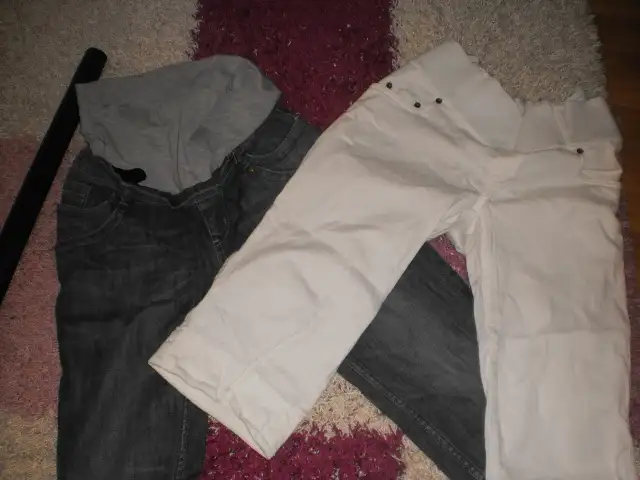 sıyah ve denim kot pantolonlar.. ((sıyah olanın gobek koruma yerınde hafif bır sökük var görülmuyor bıle.)) biri lcw biri gebe marka denim kot ve kanvas kapriler hamile tunik beyaz tsortle cok hoş oluyor gebe marka hamileliğin son aylarında rahatlıkla kullanılabılecegınız yumusak denim kumaş hamile gomlegı bel kısmı lastıklidir