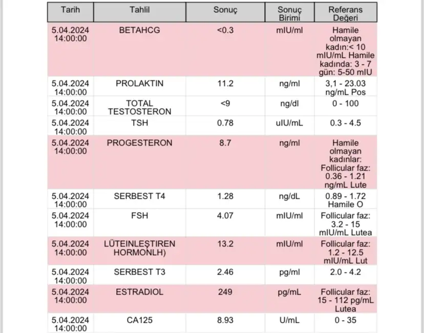 4 yıllık evliyiz 3 yıldır deniyoruz ilk zamanlar doktora gittik eşimle hiç bi sıkıntı yok stres yapmayın 6 ay deneyin olur demişlerdi 3 yıldır olmuyor adetlerim çok düzensiz en son 2 martta adet oldum 38 gün oldu hala adet olamadım 2 gün önce doktora gittim kan testi verdim bayram tatili araya girince sonuçlarım kaldı anlayan varsa bakabilir mi acaba