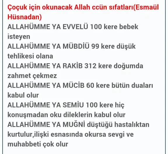 bi kadın güünde 10dan fazla okuomuş rüyasında arkadaşını görmüş yıllardr görmediği arkadaşıymış . ertesi günde arkadaşı çıkmış gelmiş aynı rüyadaki gibi ... ben bu dua yı okudım ama her gün bitane ağır gelmesin die 5kere rüyamda bebek gördüm ertesi gece hamilelik testi gördüm gittikçe silikleşen ama karma karışıktı zaten üç gün sonra hamile olduğumu öğrendim ertesi haftada bebeğimi kaybettim.... okadr mucize bir dua arkadaşlar allah hepimize hayırlı evlat lar nasip etsin(RABBİ HEB Lİ MİNES SALİHATİN)