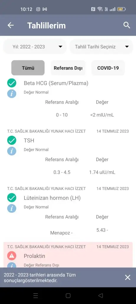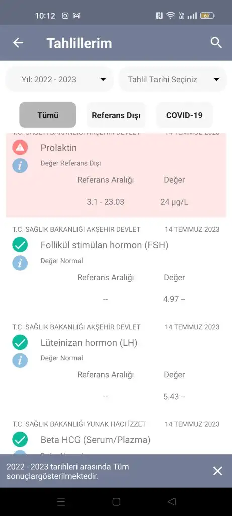 Prolaktin (süt hormonu) peynir ve incir gibi şeyler tüketiyor musun yüksek çikmiş dikkat et. Tsh, serbest t3 ve t4 olan tiroidle ilgili onlar normal çıkmış yüksek ya da düşük olmaması lazım. Lh ve fsh da iyi onlarda yumurtalarınla alakalı. Onlarda iyi ama bunları adetliyken baktırdın değil mi ?Bunlar sonuclarim