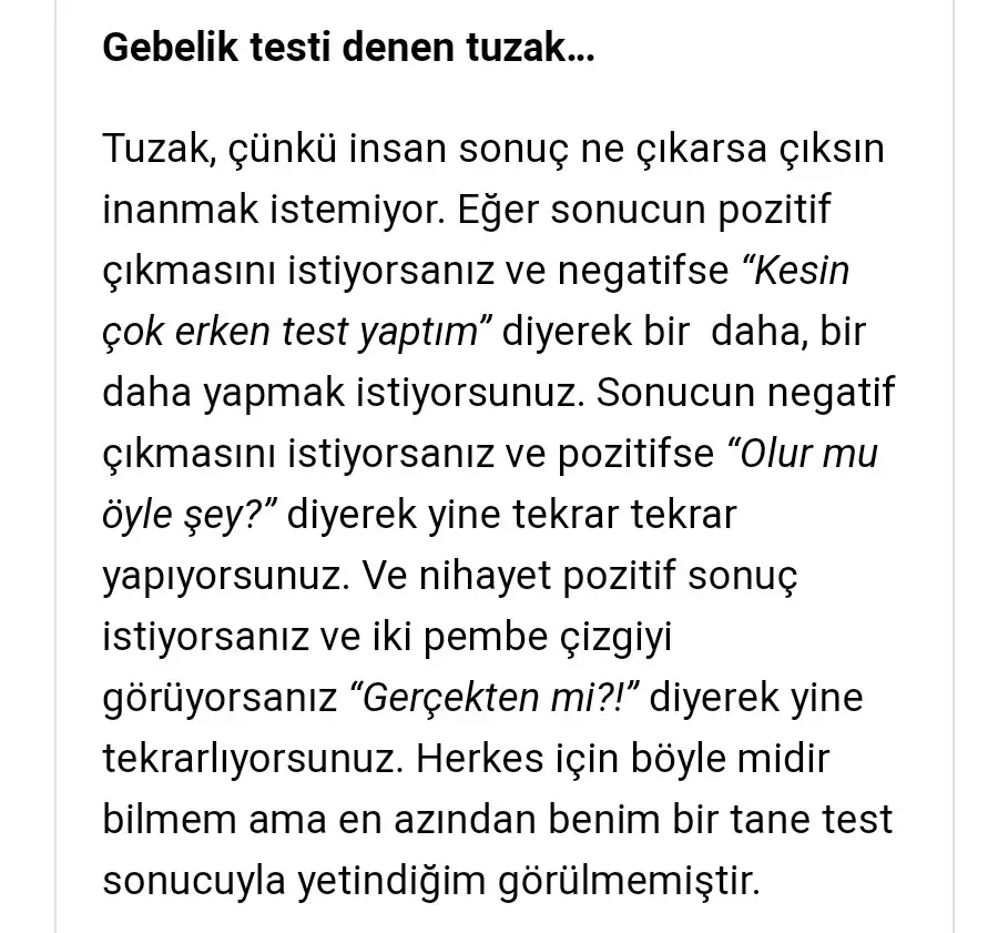 Yalnız olmadığımı bilmek ne güzel. Yoksa delirdiğimi düşünücem gerçekten. Geç döllenme hikayelerine dur bende bi daliyim da uyuşturayım beynimiBen 2 gün önce kan testinde negatif gördüğüm halde, ya belki erken kan vermişimdir, belki geç döllenmedir diye hafiften kafamda kurdumDüşün bak kan testi adete 3 gün kala negatif ama hala umudum bitmedi