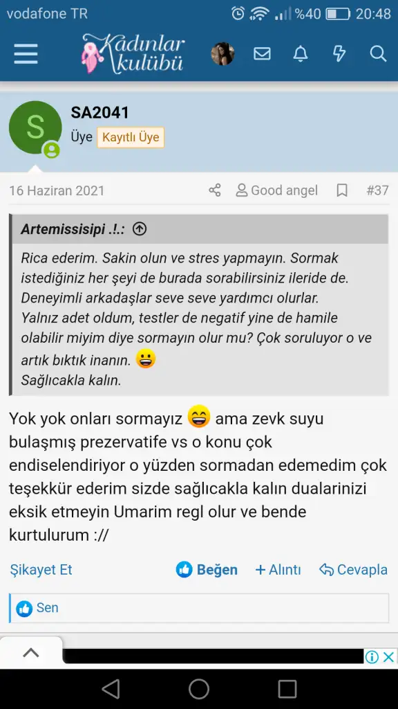 Gerçekten çok saçma geliyor düşününce imkansız ötesi abla belki başkası bana bu konuyu anlatıp sorsa bende mucize olur adet olmuşsun testler negatif zevk suyu dogrudan içine gelmemiş prezervatifin üstüne bulaşıp sıvı özelliğini kaybetmiş hamile değilsin derdim ama kendimde düşününce korkularım engel oluyor mantıklı düşünmemeBak sana daha önce de söyledim. Prezervatif ne kadar hamile kalabilirse sen de o kadar hamile kalabilirdin şu durumda. Ha hala diyorsan ki hamile olabilirim o zaman sana göre prezervatif de hamiledir. Yani prezervatif sevgilimden hamile kaldı dediğini bir düşün. Hatta bu cümleyi söyle bakalım sana ne kadar mantıklı ve bilimsel geliyor.