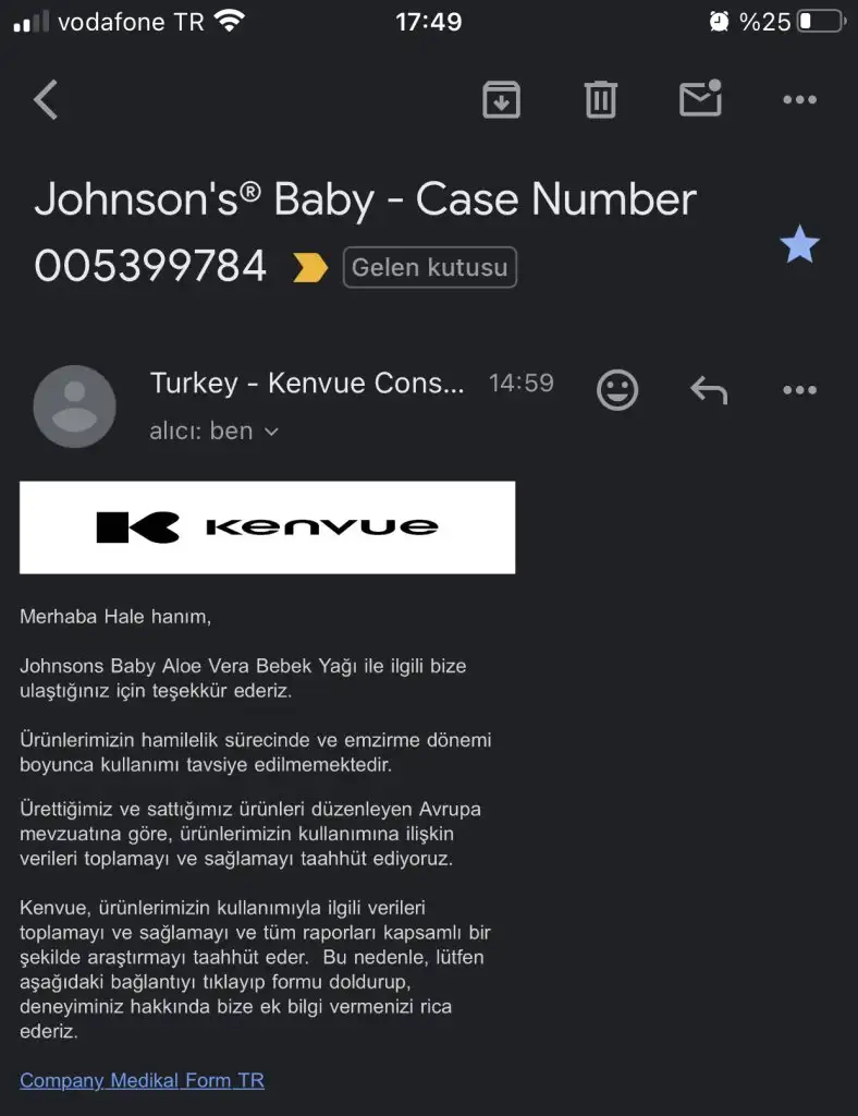 Mrbb arkadaşlar.Bugün 6 saat acildeydim.Karnımda kollarımda ve üst bacak bölgemde yanık gibi 3 gündür kabarcıklar,kaşıntı berbat haldeyim .geceden buyana şiddetlendi.hamileyim ve acilde durumum berbat olduğu için avril-dekort iğne ve serum tedavisi oldu.C kategorisi bir ilaç ama mecburiyetten oldum.Alerjinin sebebinin jhonsonbaby aloeveralı yağ olduğunu yazmak istedim.kolestaz olduğumu sandık herşey temizdi.Bu yağı kullanıp birçok alerji yaşayan insanlar olmuş aynı şikayetler.Alerjjik biri değilim ilk kez yaşadım.Lütfen gebelikte bir ürün kullanırken 10kere düşünün.kabus gibi şuan yaşadıklarım.Dr onayıylada kesinleşti alerji.Parmağımla sürdüm tekrar anında kabardı.Lütfen dikkat edin:(İyileşmek için bekliyorum artık