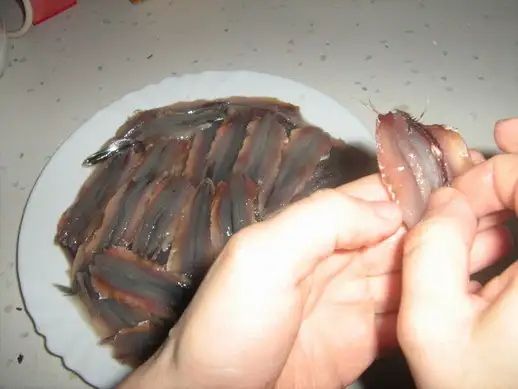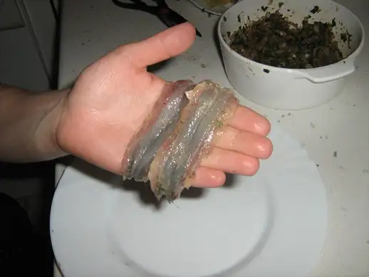 Öncelikle hamsileri ayılıyoruz ve kılçıklarını çıkartıyoruz. Tek tek ayrılmamasına dikkat ederek yıkıyoruz ve süzgece alıyoruz süzülmeye bırakıyoruz. Bu arada 4 soğanı doğruyoruz acısı çıkması için tuzla ovuyoruz ve yıkayıp süzdürüyoruz daha sonra yarım demet maydonozu kıyıyoruz ve soğanlara katıyoruz üzerine tuz, karabiber, pulbiberi katıp iyice karıştırıp özdeşlesmesini sağlıyoruz. Süzülen balıkları tuzlayıp bir tabağa alıyoruz. Öncelikle bir balığı avucumuzun içine içi üste bakacak şekilde koyuyoruz öbür balığı da biraz üstüne gelecek şekilde yanına koyuyoruz. İç harcımızdan bir tatlı kaşığı kadar alıp yayıyoruz ve üzerine iki balığı alttakiler gibi bu sefer parlak kısmı üstte kalacak şekilde kapatıyoruz ve avucumuzu kapatıyoruz önce alt ve üst kısımlarını iyice yapışması için sıkıyoruz sonra sıkarak avucumuzda döndürerek her tarafının birbirine yapışmasını sağlıyoruz. Tüm balıklar bitene kadar bu işlemi tekrar ediyoruz.