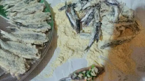 -Kılçıkları ayıklanmış hamsiler,mısır unu konmuş tabağa alınır ve mısır ununa bulanır..(Mısır unu sermek için kağıt kullanırsak daha az bulaşığımız çıkar ve de kabımız hamsi kokmaz)