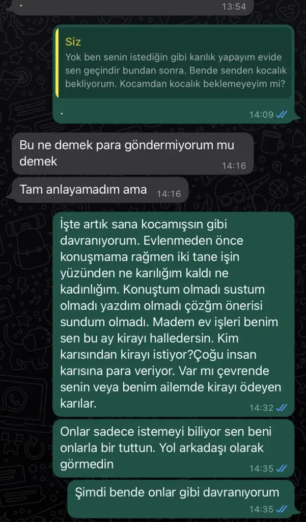 Bende iki iş yapıp sokunmayayım aylarca olmaz ki. Sanırım o yüzdenmiş. Ne acı.Şuan söylediğim(çünkü hala tartışıyoruz) her cümlede her türlü ikimizde kaybediyormuşuz gibi geliyor. Ama o başlattı ve başlatırken hiç düşünmedi. Sonunun böyle olacağını bilse kafasında terasa götürürdü o çayı ama yapacak bir şey yok.Pes etmeyin. Her kuşun etinin yenmeyeceğini bilsin. Ya dün o yüzden ev işi yaptı benceMaaş istemeye yüzü olsun diye