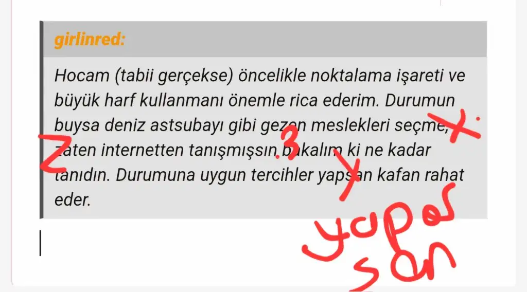 Neden beğenmediniz ? Keşke birine imla kurallarını hatırlatırken dönüp yazdığınız mesaja bir baksaydınız. Kaç tane hata olduğunu sayın isterseniz. Ayrıca tanımadığınız birine bu platformlarda yorum yaparken siz diye hitap etmelisiniz.Hocam (tabii gerçekse) öncelikle noktalama işareti ve büyük harf kullanmanı önemle rica ederim. Durumun buysa deniz astsubayı gibi gezen meslekleri seçme, zaten internetten tanışmışsın bakalım ki ne kadar tanıdın. Durumuna uygun tercihler yapsan kafan rahat eder.