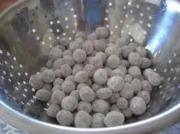 Kofteleri hazirlamak zaten cok kolay, ben genelde 200 gr kiymadan yapiyorum. Icine kofteye kullandigimiz baharatlari katiyorum (tuz, karabiber, kimyon, yenibahar, toz kirmizi biber vs.), ekmek katmiyoruz, 1 cay bardagi kadar ince bulgur katiyorum, biraz salca (1 tatli kasigi kadar) yoguruyorum bu karisimi. Daha sonra minik misketler haline getiriyorum... Un dolu bir kabin icine atiyorum, her attigim misketten sonra kabi sallayinca unlaniyorlar zaten, fazla mudahale istemiyor... Onlari bir kenara koyuyorum.