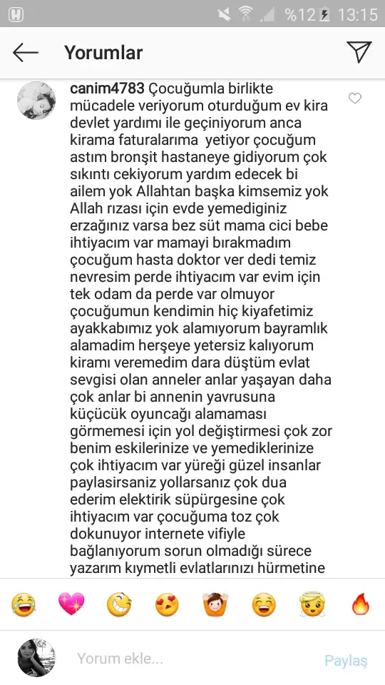 onları alıp satıyorlar ama.böyle hemen inanmayın , fakirlikten ölüyor ama instagramda geziyor? belediyelere kaymakamlıklara başvursun.siz de eğer yardım toplamak istiyorsanız böyle makamlara başvurup durum tespiti yaptırıp resmi bir yardımda bulunun.