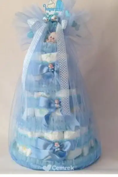 Bebek bezinden iki uc katlı pasta gibi yapılıyor ustune tul kurdele vs konup süsleniyor görsel güzellik