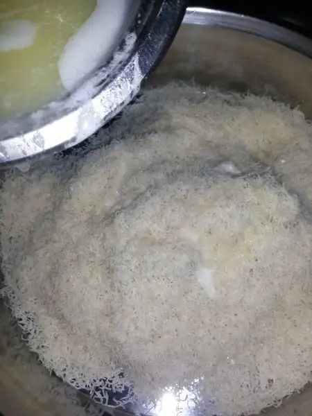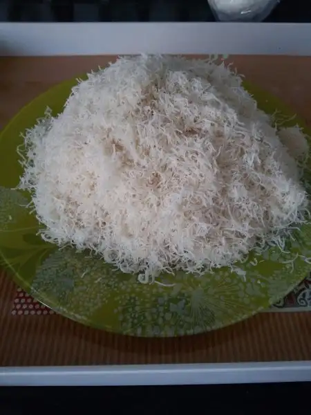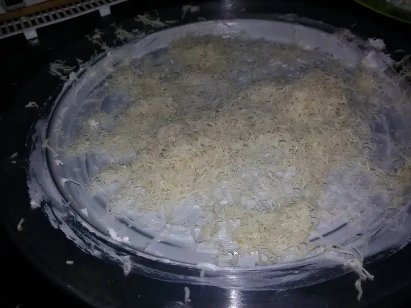 Tel kadayıf elimizle ufalanır. Üzerine tereyağ azar azar dökülür.