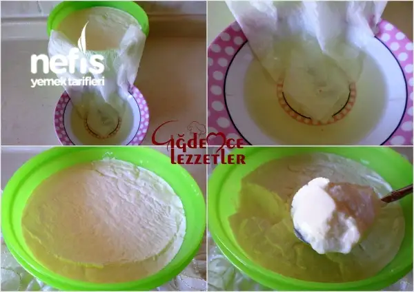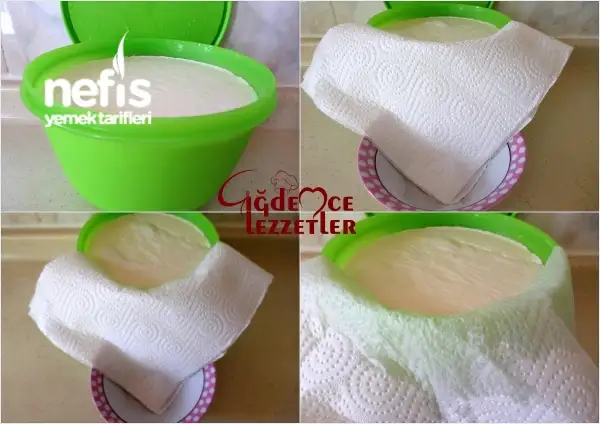 Buraya kadar herşey normal yoğurt mayalama tarifi eminim hepiniz biliyorsunuz. Yoğurdumuzu dolapta 1 gün bekletelim. Daha sonra tezgah üzerine alalım. 2 kat havlu peçeteyi az bir kısmı yoğurt üzerine yapıştıralım. Kalan kısmı yani fazla olan kısmı kaptan dışarıya çıkacak. Uç kısmına da bir tabak bırakalım. Peçetenin çektiği su bu kapta toplanacak. Dilerseniz bu suyu içebilirsiniz. Hatta bir bilgi aktarayım ki ev yoğurdundaki bu yeşil su aç karna içildiğinde 1 numaralı kabızlık önleyici özelliktedir. Muhteşem bağırsak çalıştırıyor. Özellikle bebeklerde çok işe yarıyor:)
