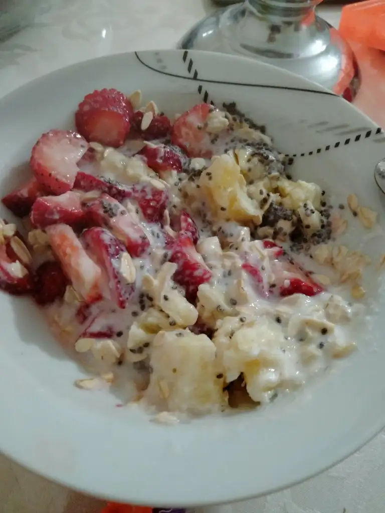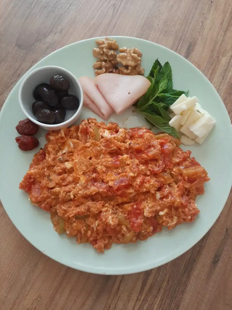 Sabah kahvaltım; 2 yemek kaşığı yulaftan, soğanlı menemen, 2 dilim hindi füme, 25 gram peynir, 2 tam ceviz, 2 kuru çilek, 8 zeytin, nane, ekmeksiz yedim.