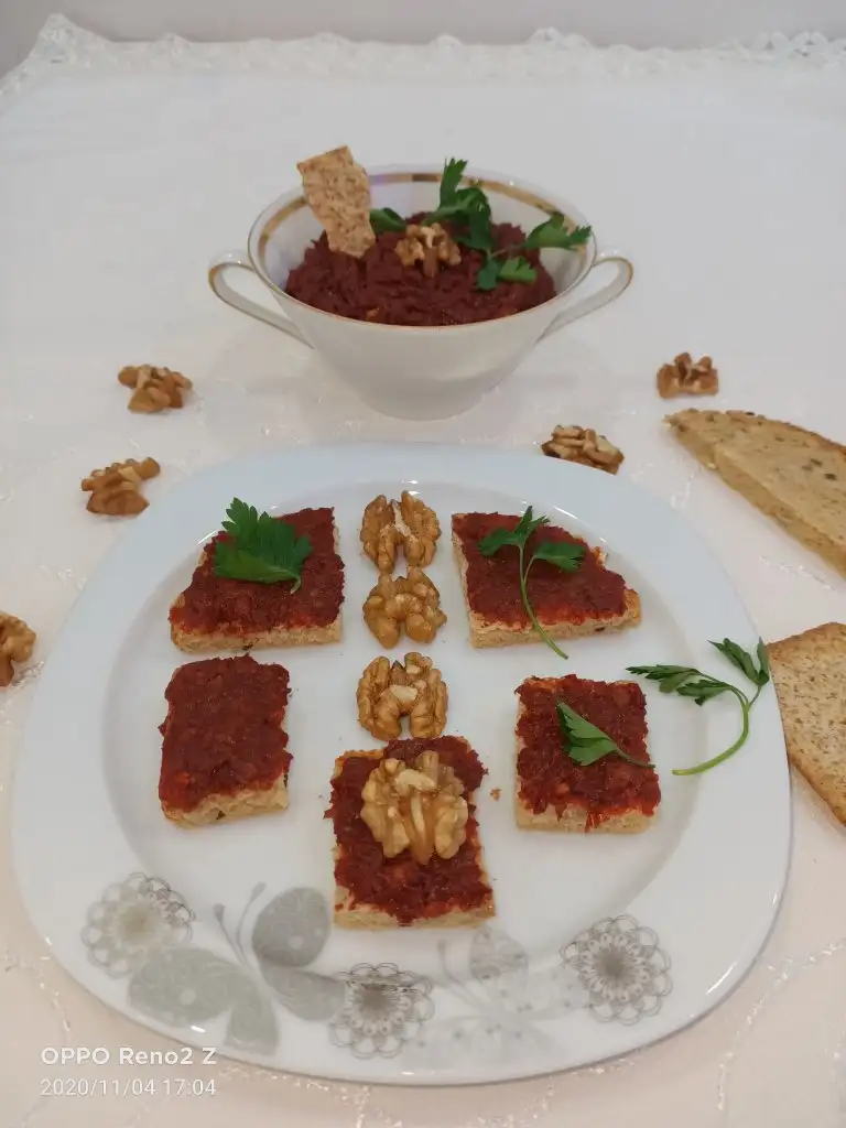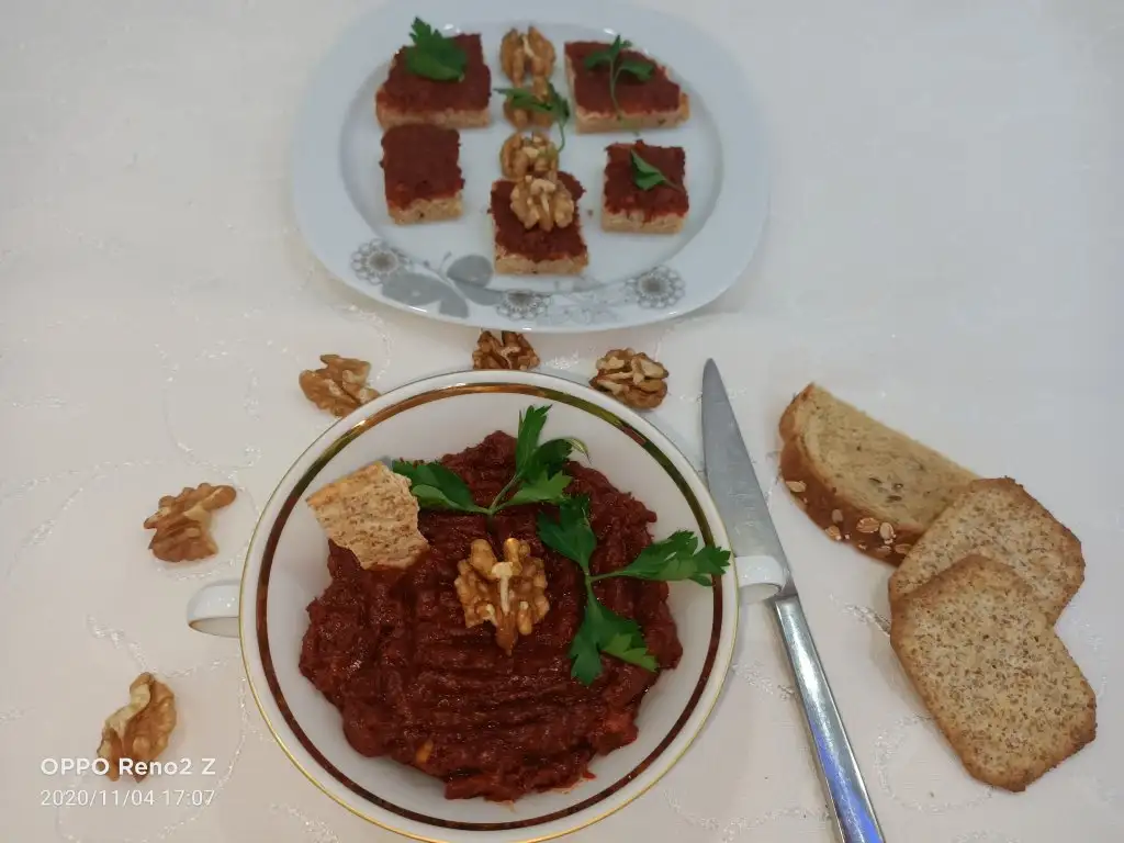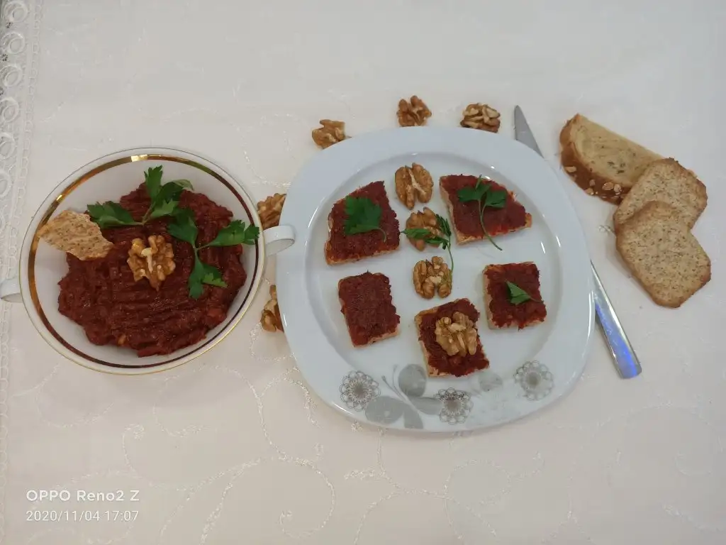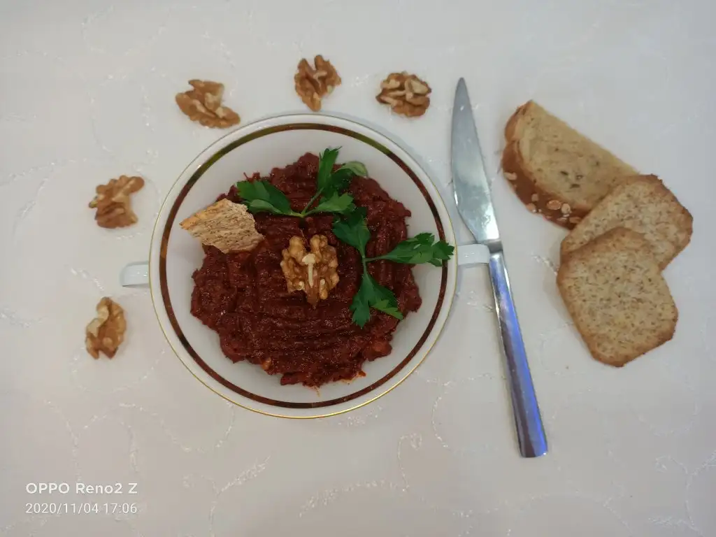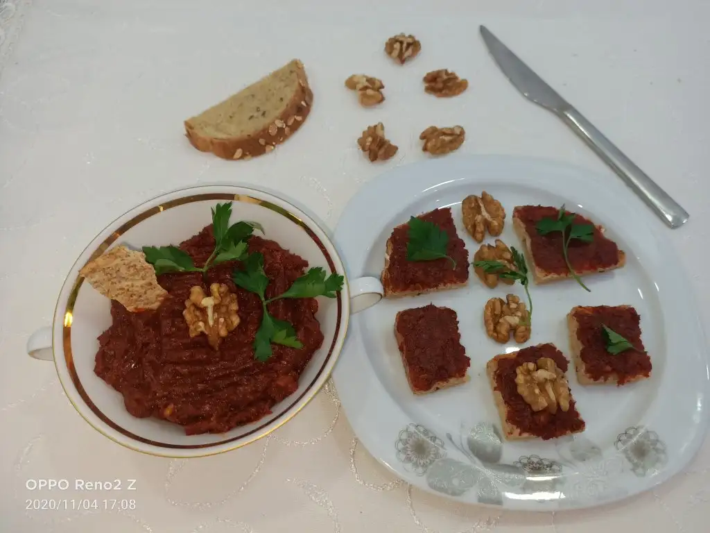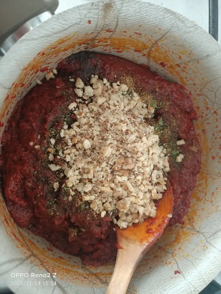 Zeytinyağını tavaya alıp üzerine salçaları ve rendelenmiş sarımsağı ekleyip 5 dakika kısık ateşte kavuralım. Daha sonra cevizi ve baharatları ilave edip karıştırıp kapatalım.