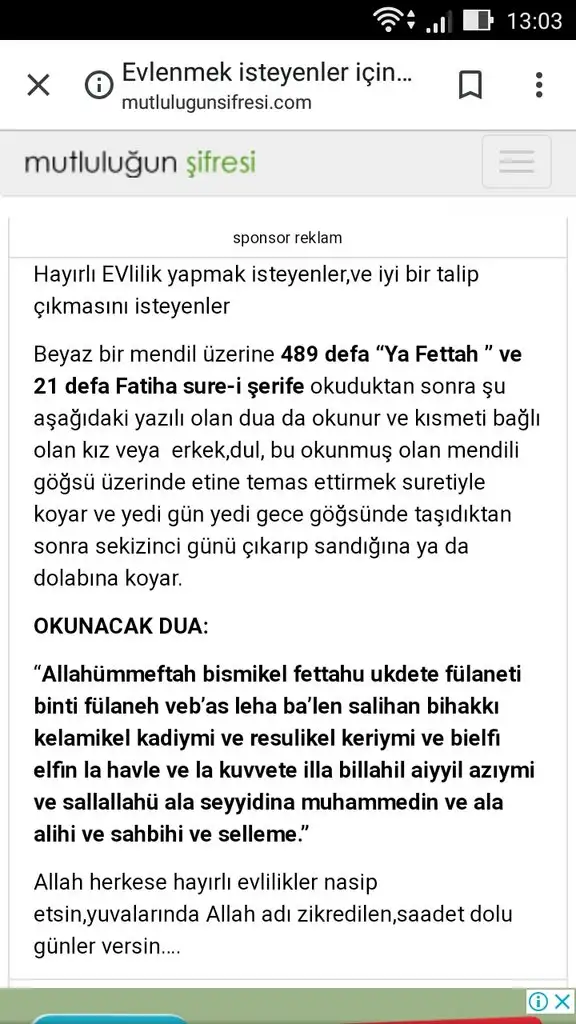 msjinizi yeni gördüm kızlar bi beyaz mendil ya da kumaşa okunuyo ben bulamamıştım bi parca kağıt havluya okumuştum abdest alip zikiri cekiliyo sure okunuyo en sonda duayı okuyorsunuz sonra da istediğiniz insanın özelliklerini söyleyin ben abdestli namazlı sadik sigara içmeyen beni çok sevecek felan diye söylemiştim sonra mendile üfledim ve iki göğsün arasına koyuyosunuz düşerse diye çamaşırınıza dikedebilirsiniz perşembe akşamı yapmanızı tavsiye ederim 7 gün duruyo 8.gün çıkartın dolabiniza veya çantanıza koyun kısa surede size teklifler gelmeye birileri haber göndermeye başlıyor siz de o kişileri degerlendirin allah gönlünüze gore verir inşallah