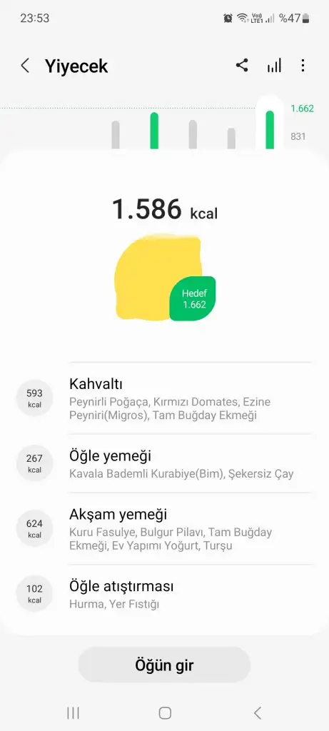 Her şeyden yedim ama az yedim mesela turşu 3 ince dilim salatalikti ama ben porsiyon olarak girdin onuYediklerine bakıncaama kalori cok değil. Ben cok açım uyuyamıyorum