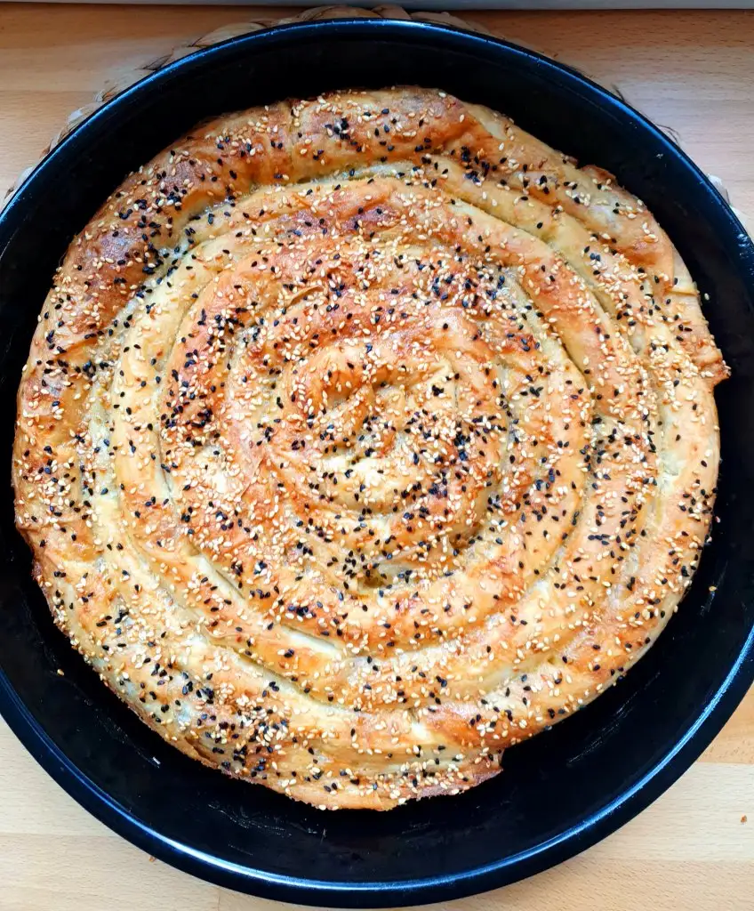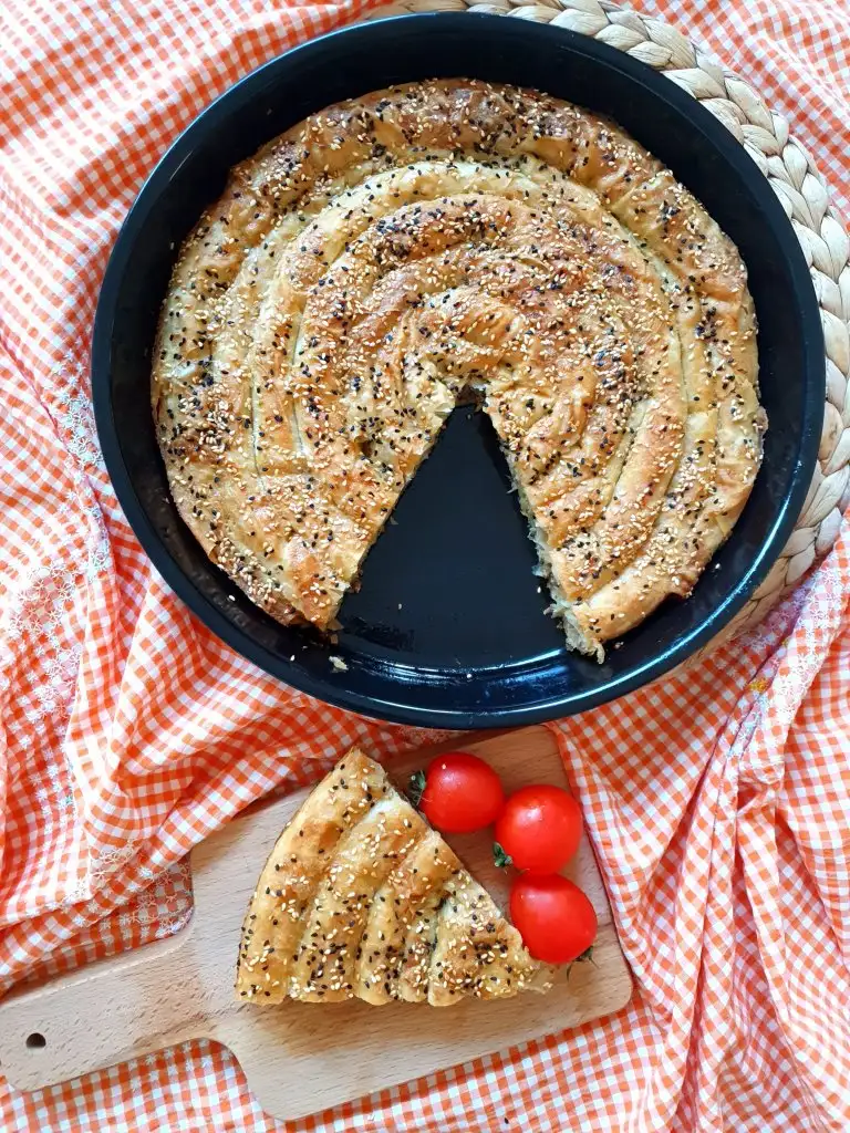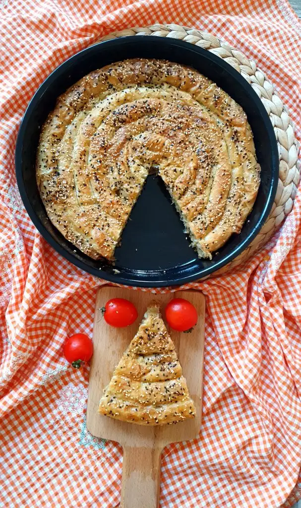 Yufkanın düz kısmına harçtan koyup rulo şeklinde sarıyoruz. Tepsimizi yağlıyoruz ve ilk ruloyu tepsinin ortasına spiral şeklinde ( gül böreği gibi) yerleştiriyoruz. Diğer ruloları da sırasıyla etrafına döküyoruz.