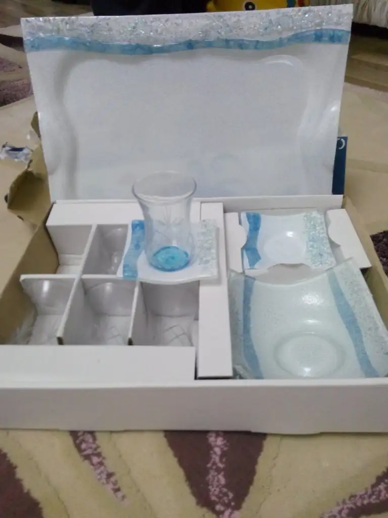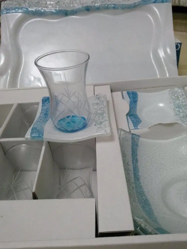 7.14 parça kütahya cam çay takımı hediye geldi hiç kullanmadım tepsi ve şekerlik içinde :20 tl