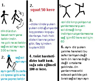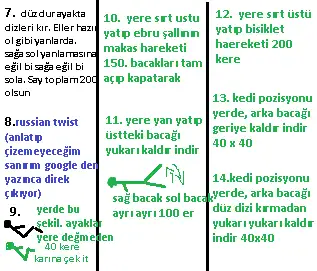 Egzersizlerim şunlar arkadaşlar; (yapmak isterseniz sayısını sürenizi kendinize göre ayarlayın burada yazanlar belki ağır belki çok hafif gelebilir)