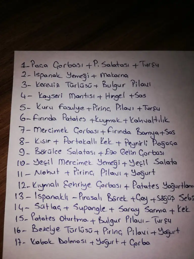 ben yemek yapmasini yeni ögreniyorum, benim listelerim hep ayni resmen 😂 Ama istersen yinede paylasirim. Türkyede herkes cok cesit yapiyor.
