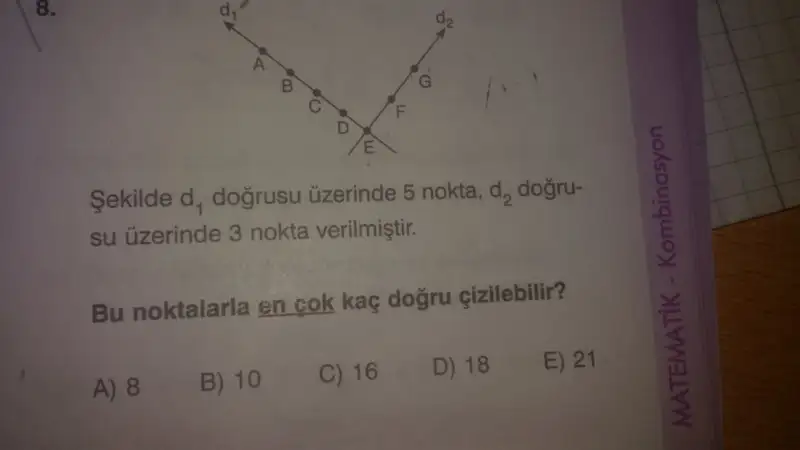 O doğruları noktalarn doğrusal olduğunu anlayalm diye vermiş yoksa orda sadece a, b, c, d, e, f, g noktalari var yani biz d1 ve d2 Olarak 2 doğru daha cizebilirz. Toplam 10.