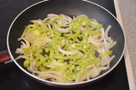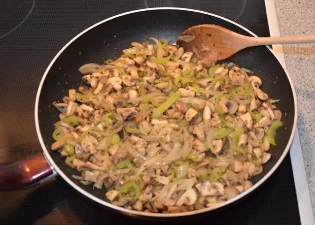 Yapılışı: Öncelikle soğanları halka şeklinde, ya da benim gibi kocaman bir soğanı ikiye böldüyseniz içlerini birbirinden çıkararak uzun dilimler elde ediyoruz. Tadı çok güzel olan bir sızma zeytinyağı işin püf noktası aslında, yemeğe aşırı lezzet katıyor. Tavaya biraz yağ döktükten sonra ince kestiğimiz çarliston biberler ile soğanları kavuruyoruz. Daha sonra kekik ve tuz ekleyip küçük doğradığımız mantarları da pişene dek kavurmaya devam ediyoruz.